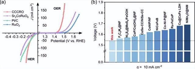 电化学测试显示,CCCRO在碱性电解液氧析出反应电流密度达到10mA cm-2时所需过电位仅为198 mV,优于商业RuO2;在析氢反应中达到10 mA cm-2电流密度所需过电位为46 mV,与商业Pt/C接近;在工业级电流密度100 mA cm-2下,CCCRO可连续运行超过500小时不衰减,具有很好的稳定性。原位X射线吸收谱与第一性原理计算结果显示,在析氧条件下,Cu、Co与Ru之间的三金属电子协同作用,可优化局域电子态,保持稳定的钙钛矿骨架;在析氢条件下,材料发生反应驱动的表面重构,自发形成Cu–Co–Ru合金纳米活性相,可增强电子和表面活性位点的耦合。