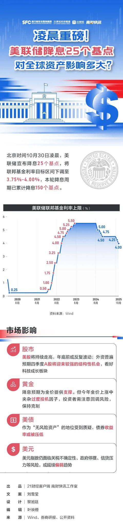 当地时间10月29日,美联储宣布将联邦基金利率目标区间下调25个基点到3.75%至4.00%之间。这是美联储继9月17日降息25个基点后再次降息,也是自2024年9月以来第五次降息。
