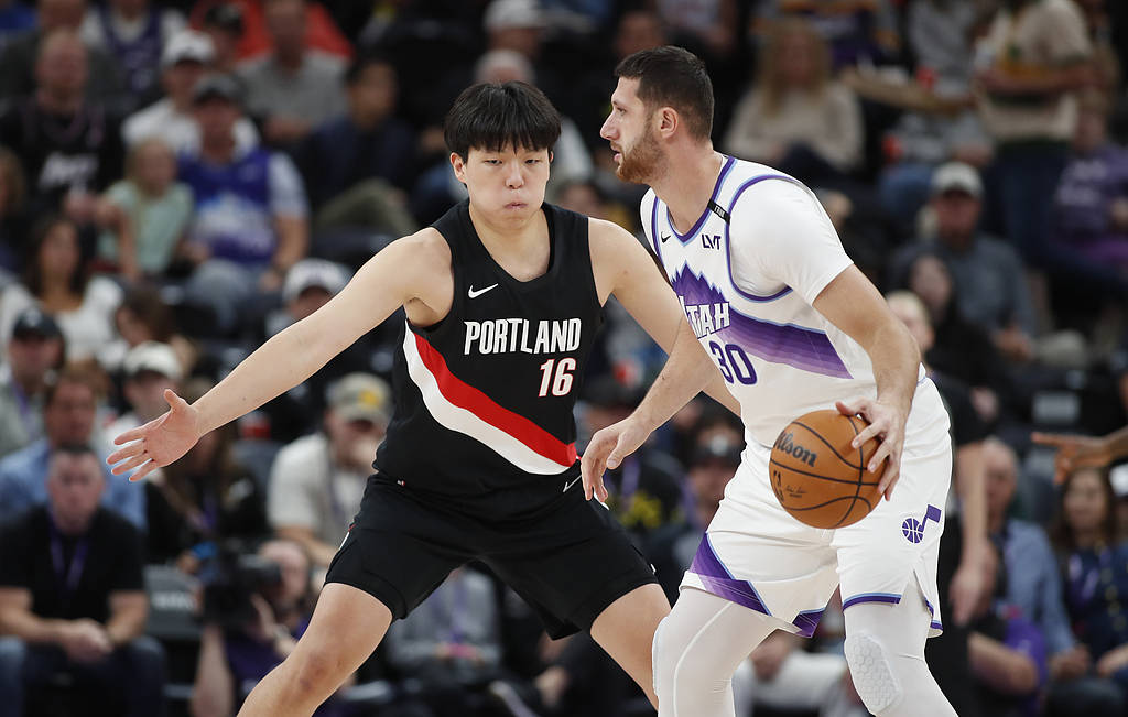 组图:开拓者险胜爵士 杨瀚森努力防守