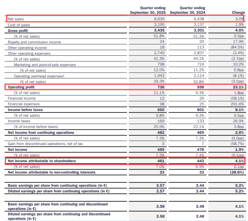 10月29日,德国运动品牌阿迪达斯发布2025年第三季度财报。今年第三季度,在全市场、全品类、全渠道均实现两位数增长的推动下,阿迪达斯品牌全球营收达66亿欧元,创下公司有史以来单季营收最高纪录,同比增3%,按固定汇率计算同比增长12%(剔除Yeezy因素);营业利润达7.36亿欧元,同比增长23%;净利润为4.85亿欧元,同比增1.9%;归母净利润达4.61亿欧元,同比增4.1%。