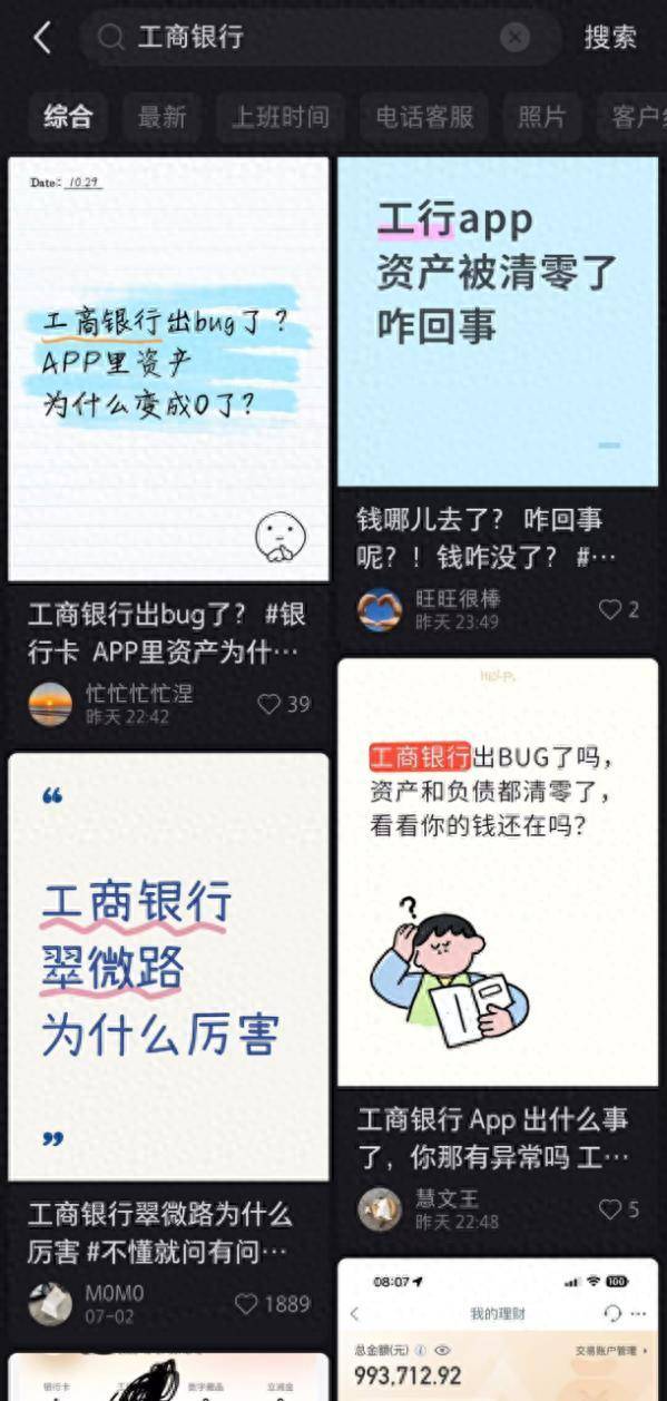 从10月29日晚上到30日早上,社交平台上多位工商银行(601398.SH)储户表示,登录工行App后发现资产被清零。有的网友表示是理财产品被清零;有的是贷款变为零。还有的表示,在工行买的基金也没有了。