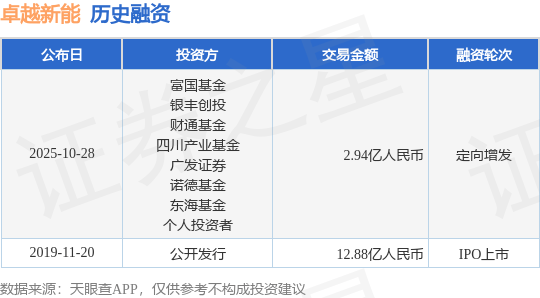 证券之星消息,根据天眼查APP于10月28日公布的信息整理,龙岩卓越新能源股份有限公司定向增发融资,融资额2.94亿人民币,参与投资的机构包括富国基金,银丰创投,财通基金,四川产业基金,广发证券,诺德基金,东海基金,个人投资者。