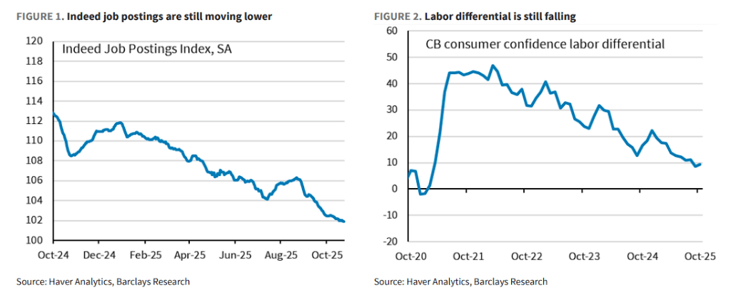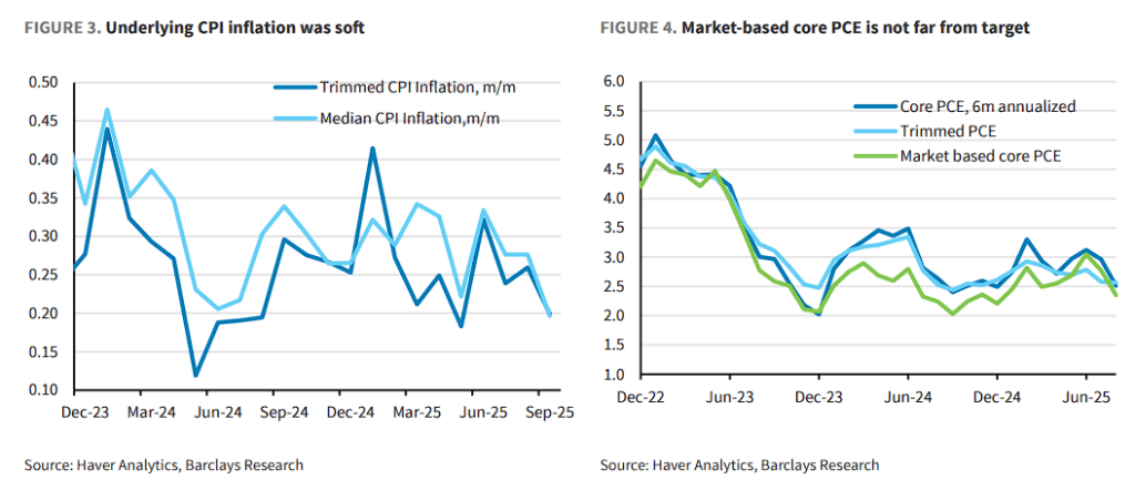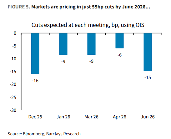 这意味着,在当前数据背景下,限制性的货币政策已无必要。巴克莱观察到,市场目前仅定价到2026年6月累计55个基点的降息,这种看法“过于一边倒”。