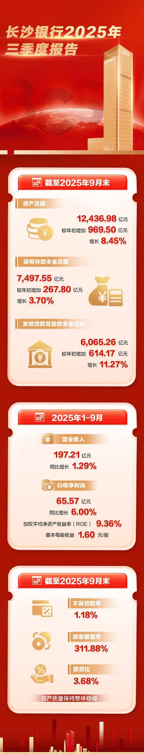 长沙晚报掌上长沙10月31日讯(全媒体记者 吴鑫矾)10月30日,长沙银行(601577)发布2025年第三季度报告显示,2025年前三季度,长沙银行实现营业收入197.21亿元,同比增长1.29%;归属于上市公司股东的净利润65.57亿元,同比增长6.00%。