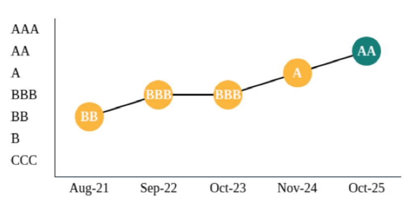 近日,国际权威指数机构摩根士丹利资本国际公司(明晟、MSCI)更新2025年度环境、社会及治理(ESG)评级信息,平安银行凭借在ESG领域的卓越表现,评级一举跃升至AA级,在短短五年内实现了从BB级到AA级的三级跃升。这一突破,彰显了平安银行在可持续发展道路上的坚定决心与强大实力,标志着其在国际金融舞台上赢得了高度认可。