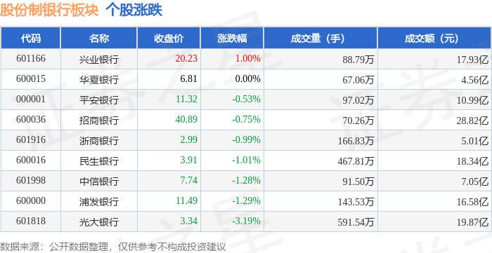 证券之星消息,10月31日股份制银行板块较上一交易日下跌0.73%,光大银行领跌。当日上证指数报收于3954.79,下跌0.81%。深证成指报收于13378.21,下跌1.14%。股份制银行板块个股涨跌见下表: