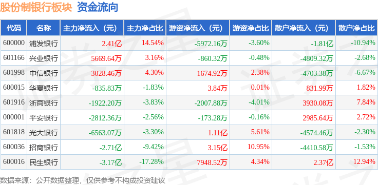 从资金流向上来看,当日股份制银行板块主力资金净流出3.81亿元,游资资金净流入4.33亿元,散户资金净流出5153.02万元。股份制银行板块个股资金流向见下表:
