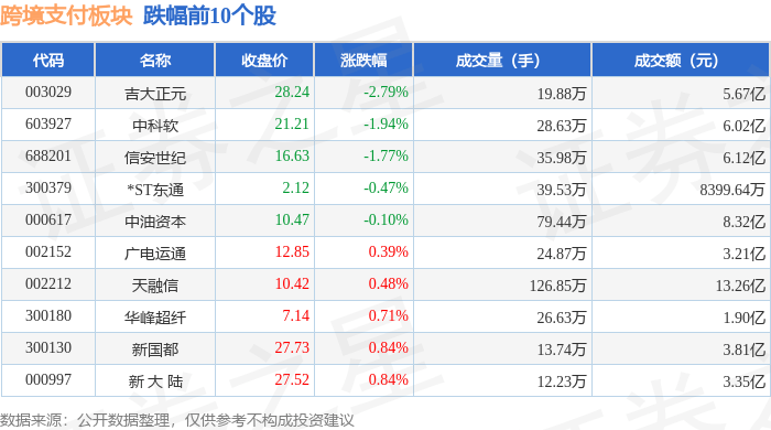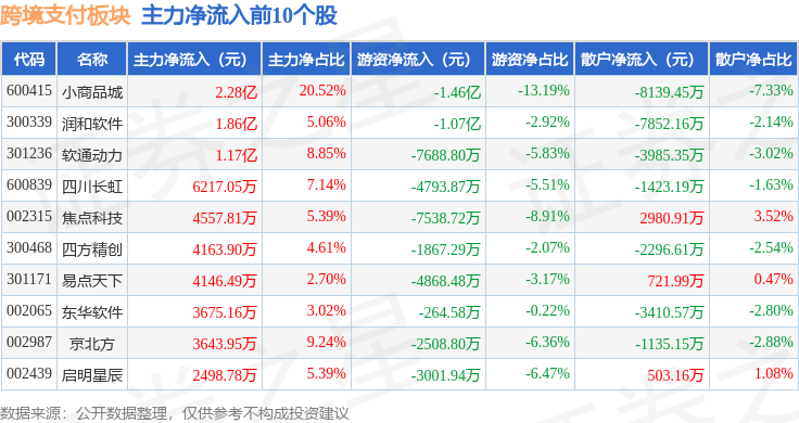 从资金流向上来看,当日跨境支付板块主力资金净流入3.25亿元,游资资金净流出8.54亿元,散户资金净流入5.29亿元。跨境支付板块个股资金流向见下表: