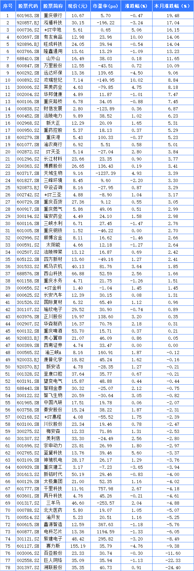 领涨的股票中,重庆银行、泓禧科技、*ST中地分别以涨幅19.48%、17.04%和16.15%,位列重庆A股本月涨幅前三强。