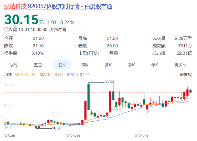 泓禧科技报收30.15元,日涨幅-3.24%,换手率3.10%,月涨幅17.04%,今年以来涨幅114.44%。
