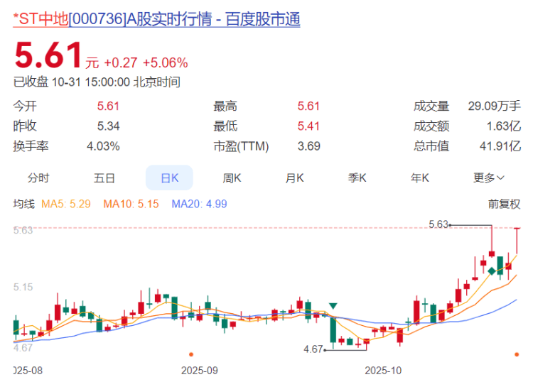 *ST中地报收5.61元,日涨幅5.06%,换手率4.03%,月涨幅16.15%,今年以来涨幅-34.77%。