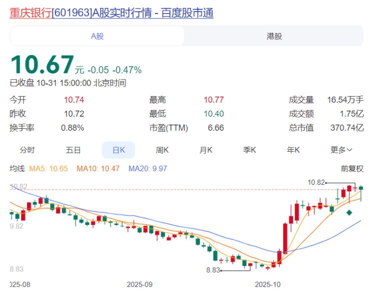 重庆银行报收10.67元,日涨幅-0.47%,换手率0.88%,月涨幅19.48%,今年以来涨幅20.35%。