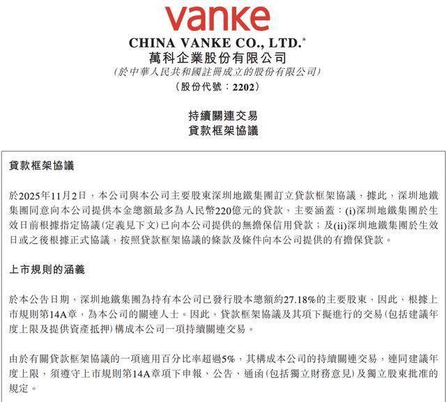 乐居财经 严明会11月2日,万科A(SZ000002)发布公告,于2025年11月2日,公司与公司主要股东深圳地铁集团订立贷款框架协议,据此,深圳地铁集团同意向公司提供本金总额最多为220亿元的贷款。