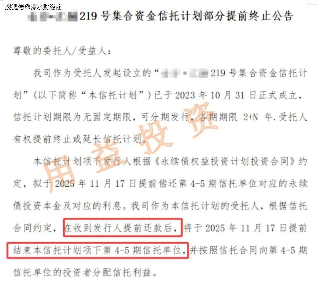 10月31日,某央企信托发布公告,拟提前偿还用于投资盐城某项目的永续债本金及对应的利息。