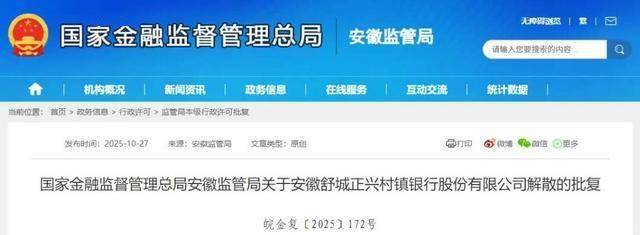 《关于安徽舒城正兴村镇银行股份有限公司解散的请示》(舒正兴银〔2025〕54号)收悉。经审核,现批复如下: