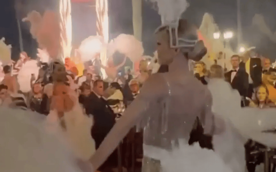在一张活动照片中,一名舞女在一个巨大的镀金马提尼酒杯中摆造型,而视频片段则展现了歌舞女郎们表演着精心编排的舞蹈。其他照片则显示,现场有一个巨大的主题冰雕用于冰镇酒水,还有各式各样、琳琅满目的甜点。