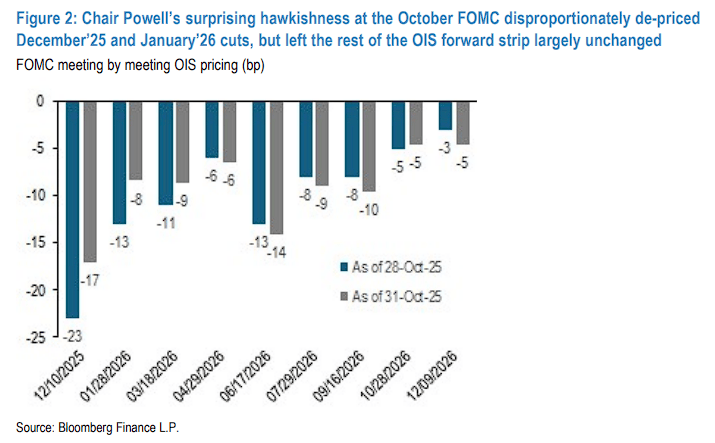 (鲍威尔主席在10月FOMC会议上出人意料的鹰派立场,导致市场大幅下调了对2025年12月和2026年1月降息的预期定价,但对OIS远期曲线的其余部分基本没有影响)