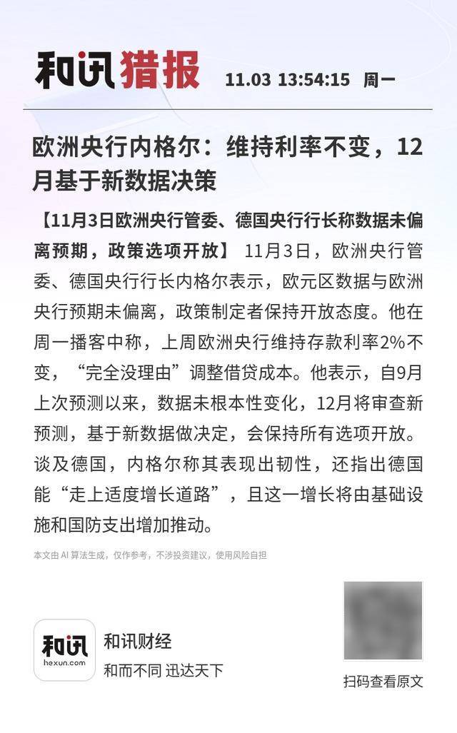 【11月3日欧洲央行管委、德国央行行长称数据未偏离预期,政策选项开放】11月3日,欧洲央行管委、德国央行行长内格尔表示,欧元区数据与欧洲央行预期未偏离,政策制定者保持开放态度。他在周一播客中称,上周欧洲央行维持存款利率2%不变,“完全没理由”调整借贷成本。他表示,自9月上次预测以来,数据未根本性变化,12月将审查新预测,基于新数据做决定,会保持所有选项开放。 谈及德国,内格尔称其表现出韧性,还指出德国能“走上适度增长道路”,且这一增长将由基础设施和国防支出增加推动。