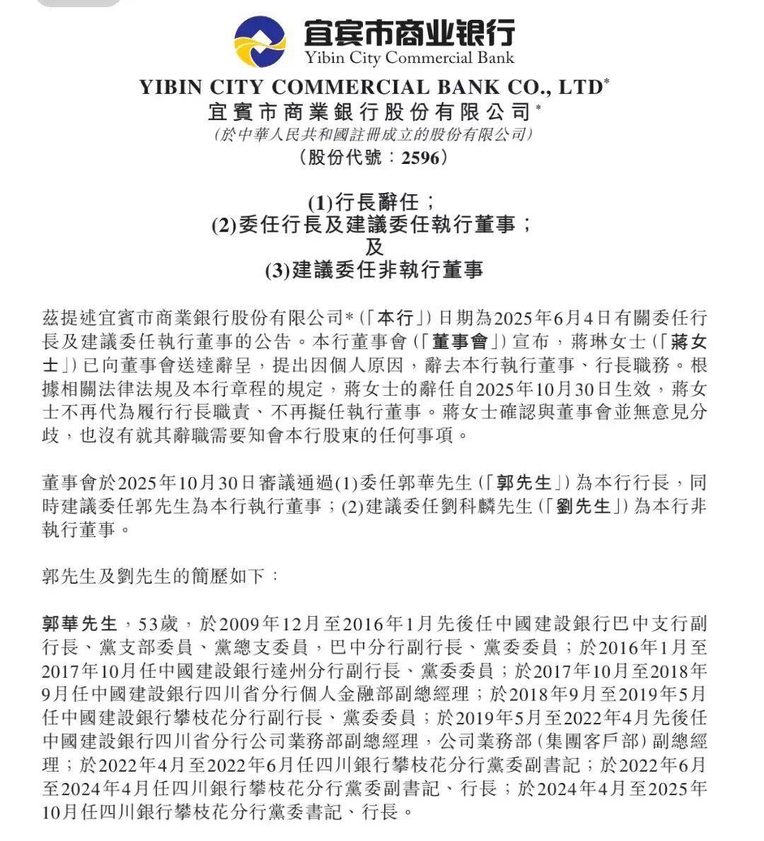 作为今年初刚登陆资本市场的"千亿级"区域城商行,宜宾市商业银行(以下简称"宜宾银行")近期因高管频繁变动引发市场关注。10月底,该行公告称46岁的蒋琳因个人原因辞去执行董事、行长职务,由53岁的郭华接任。这已是该行今年内第二次更换行长,折射出城商行高管面临的特殊挑战。