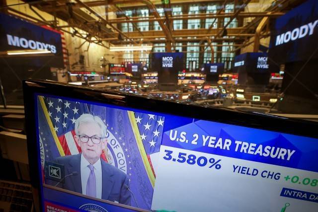 10月29日,美国纽约,纽约证券交易所内,电视屏幕上播放着美联储主席杰罗姆·鲍威尔演讲的画面。鲍威尔表示将于12月1日停止缩减央行资产负债表。视觉中国供图
