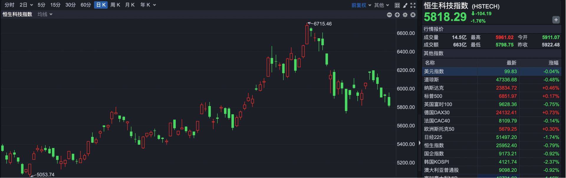 恒生科技指数报收于5818.29点,下跌104.19点,跌幅1.76%。