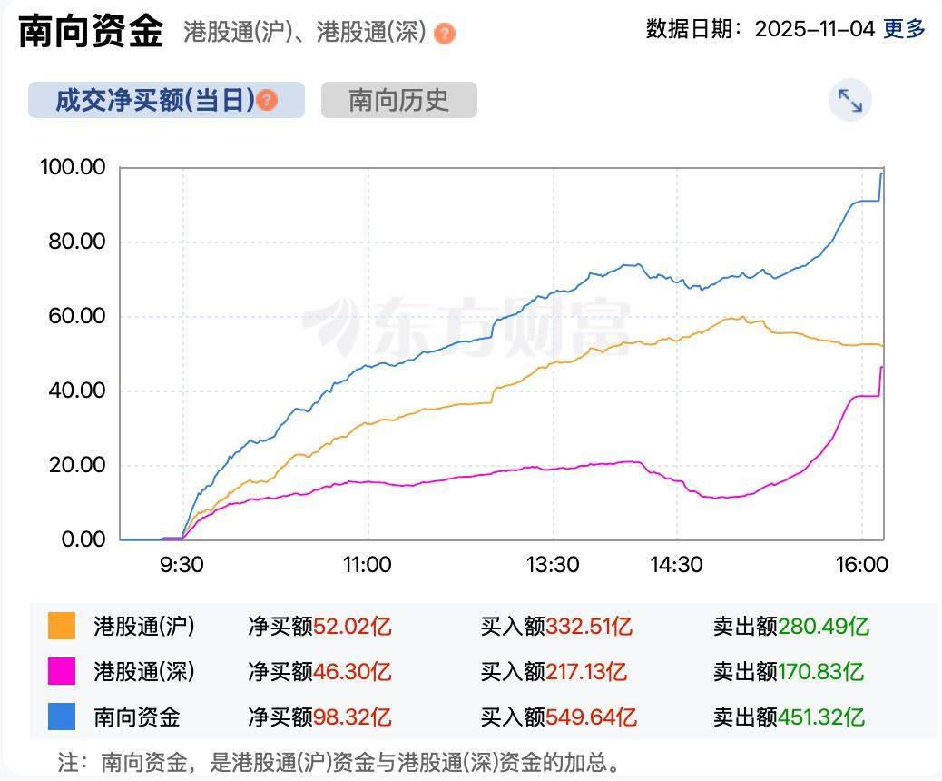 资金方面,截至收盘,南向资金净买入港股金额超98亿港元。