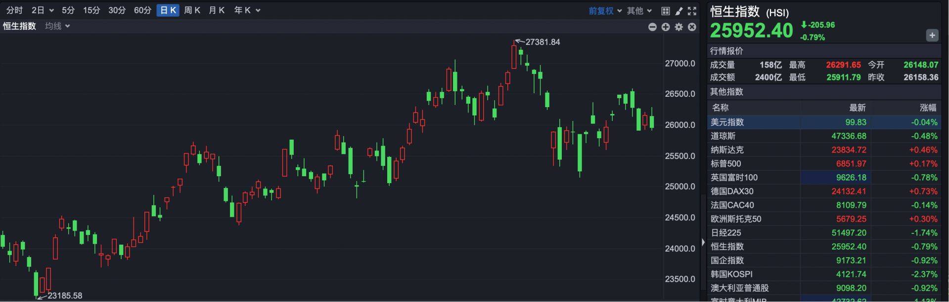 截至收盘,恒指报收于25952.40点,下跌205.96点,跌幅0.79%。