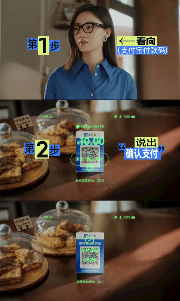 用户佩戴Rokid乐奇眼镜进行“看一下支付”,支付信息直接在眼镜显示屏上呈现,只需三步完成支付,方便、省时: