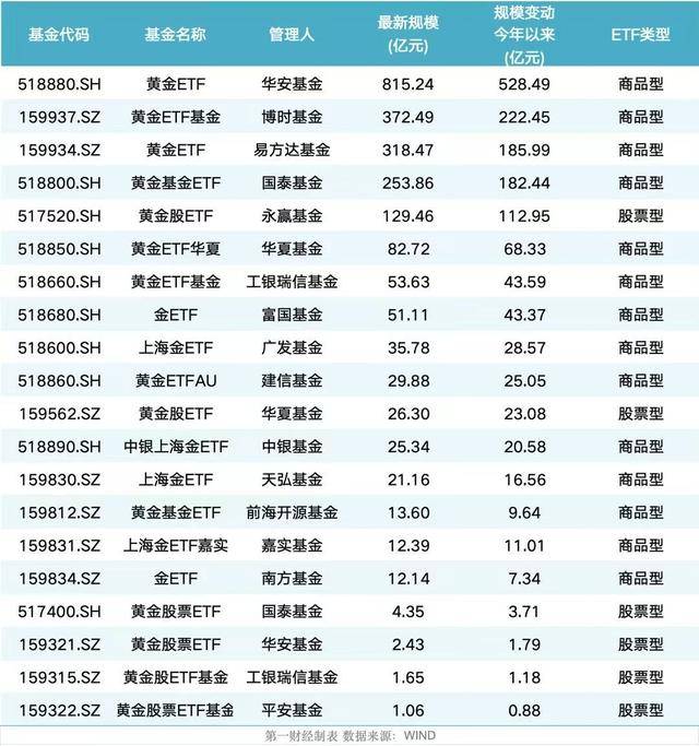 不过,产品间规模分化依然严重。目前,华安黄金ETF(518880.SH)以约815亿元规模稳居榜首,较年初大幅增加了528亿元;博时黄金ETF(159937.SZ)、易方达黄金ETF(159934.SZ)分别以总规模约372亿元、318亿元位列第二、三位,分别较年初增加了222亿元、186亿元左右;国泰、华夏类似产品规模也分别增至254亿元、83亿元。同期,多只黄金ETF规模在15亿元以下。