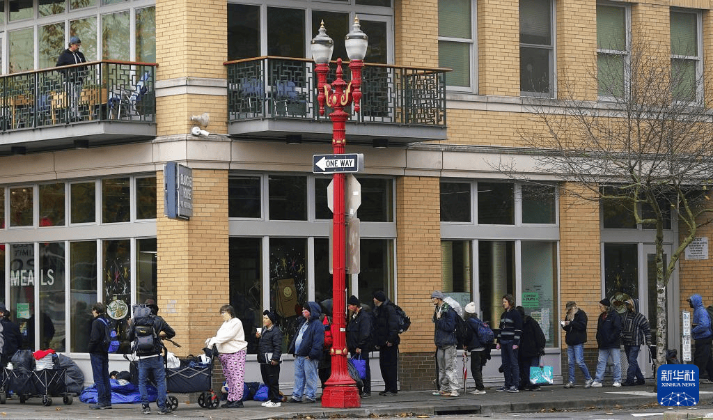 4日,在美国俄勒冈州波特兰,等待领取免费食物的人们在街头排起长队。