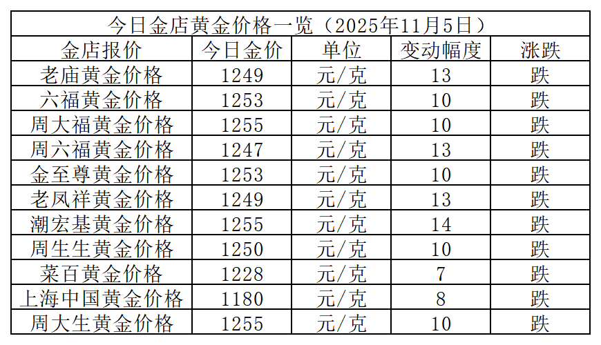11月5日金价速报,国内品牌金店的首饰金价转跌,跌幅超10元/克。其中,周大福的首饰金价下跌10元/克,报1255元/克,与多家金店并列最高价;上海中国黄金下跌8元/克,报价1180元/克,还是最低价金店。今日金价高低价差微缩,报75元/克。