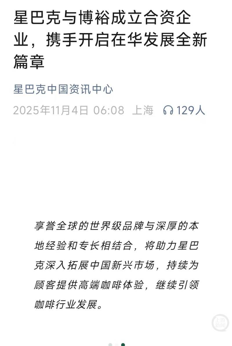 星巴克中国发布消息“星巴克与博裕资本成立合资企业”。 图据星巴克中国官微