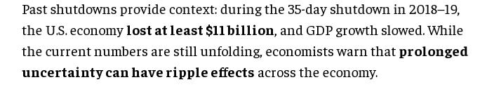 文章用数据分析说,历史数据触目惊心:2018-2019年持续35天的停摆造成至少110亿美元损失,GDP增速被拉低0.2%。当前危机正朝着追平甚至超越历史纪录的方向发展。持续的不确定性持续侵蚀消费者信心、企业投资意愿和市场稳定性。