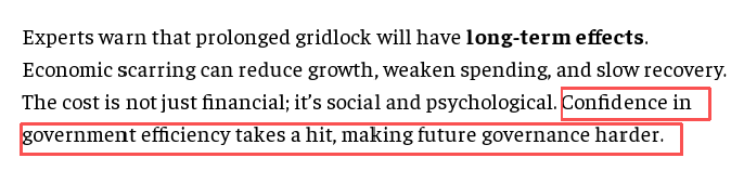 专家警告,长期停摆将造成深远伤害——经济疤痕效应会压制增长、抑制消费、延缓复苏,这不仅是财政灾难,更是对社会信任的透支。