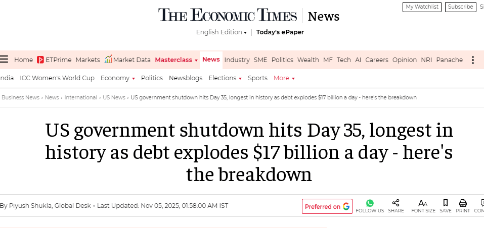 文章说,更长时间的关闭可能会提高美国的借贷成本,并降低对财政稳定的信任。评级机构可能会发出警告,国际投资者会注意到债务增长不受控制。