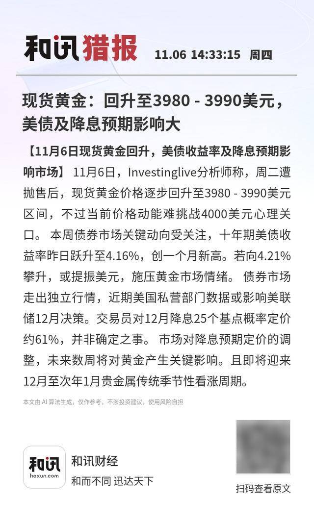 【11月6日现货黄金回升,美债收益率及降息预期影响市场】11月6日,Investinglive分析师称,周二遭抛售后,现货黄金价格逐步回升至3980 - 3990美元区间,不过当前价格动能难挑战4000美元心理关口。 本周债券市场关键动向受关注,十年期美债收益率昨日跃升至4.16%,创一个月新高。若向4.21%攀升,或提振美元,施压黄金市场情绪。 债券市场走出独立行情,近期美国私营部门数据或影响美联储12月决策。交易员对12月降息25个基点概率定价约61%,并非确定之事。 市场对降息预期定价的调整,未来数周将对黄金产生关键影响。且即将迎来12月至次年1月贵金属传统季节性看涨周期。