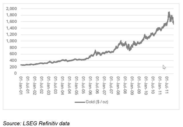 Mould紧接着指出,在2001年触及每盎司略高于250美元的低点后,黄金吸引了“新一代投资者”,他们在2001-03年科技、媒体和电信(TMT)泡沫破裂以及2007-09年金融危机爆发后的超宽松货币政策中寻求庇护。