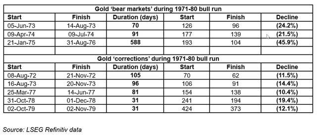 他指出,即使是上世纪70年代的黄金牛市,也出现了不少于三次的“迷你熊市”,其中金价分别在1973年和1974年下跌了20%以上,还有一次从1975年1月到1976年夏季持续了18个多月。