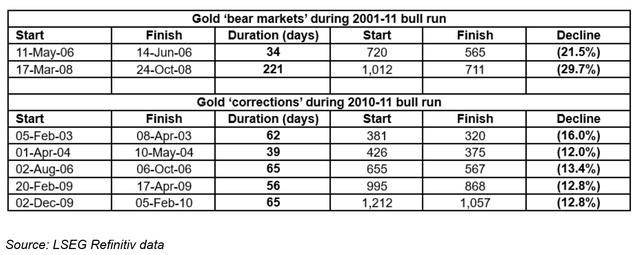 “但即使是在这第二次飙升期间,黄金也曾在2006年和2008年两次出现熊市,尽其所能考验信徒的决心,同时还有五次超过10%的修正,分别在2003年、2004年、2006年、2009年和2010年。”他补充道。