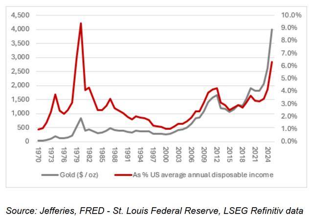 他接着解释称,“在美国总统尼克松于1971年8月让美国脱离金本位制并摧毁布雷顿森林货币体系之前,一盎司黄金仅代表美国家庭年平均可支配收入的1%。而这个数字在上世纪70年代黄金大牛市结束时的1980年末达到了9%以上的峰值。”