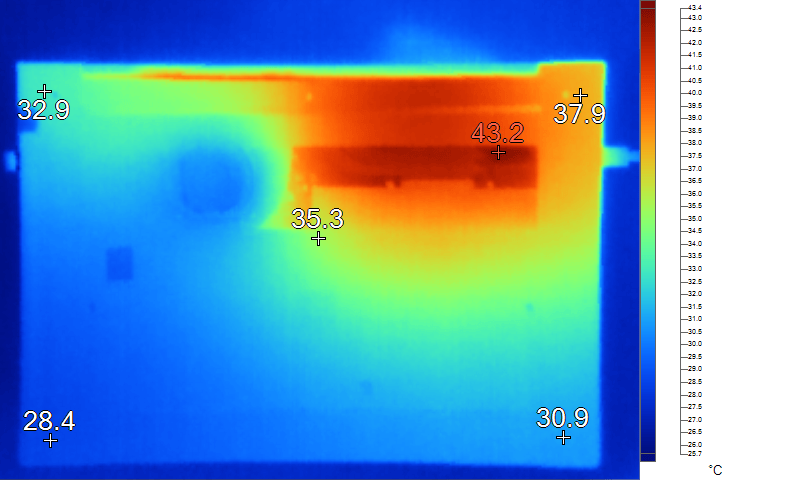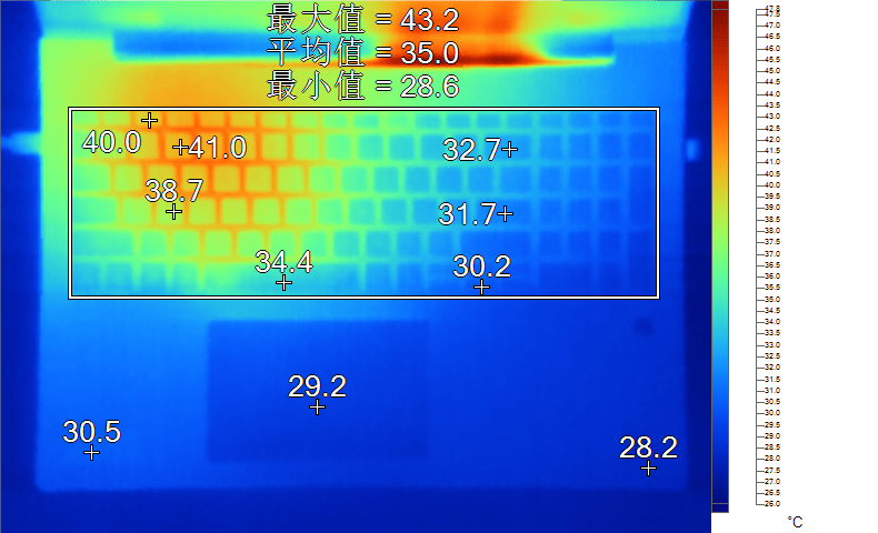 表面温度如上图所示,键盘键帽最高温度41℃出现在“数字3”上,WASD键为38.7℃,方向键30.2℃。左腕托温度为30.5℃,背面中心点35.3℃。