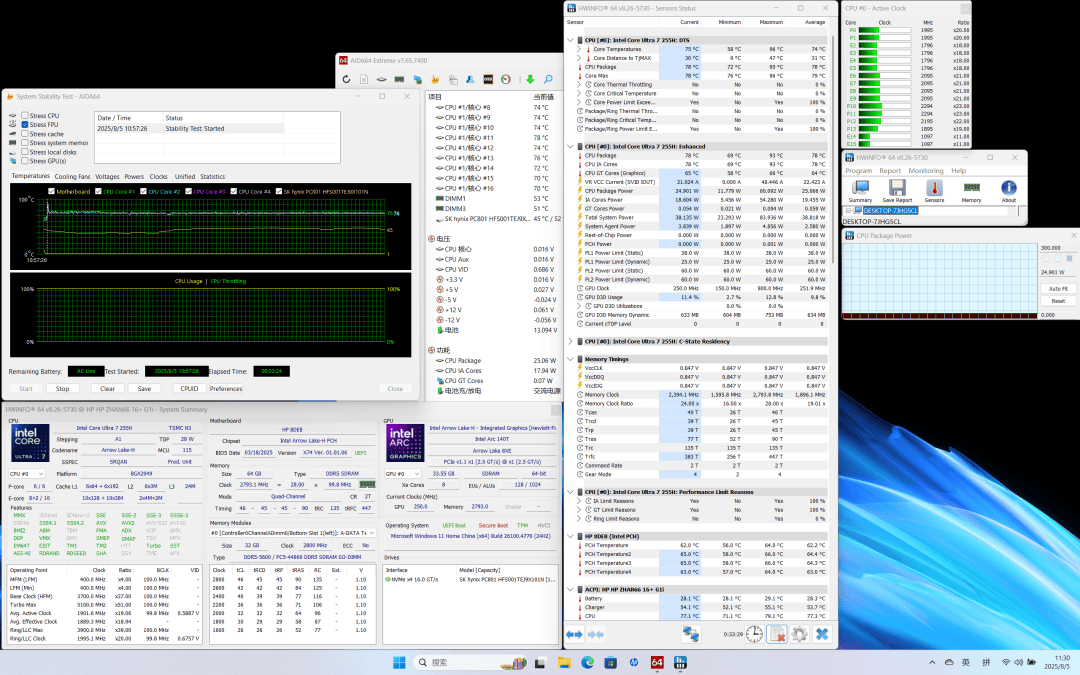 在满载状态下,CPU温度稳定在78℃,功耗25W,P核频率维持在1.9~2.3GHz,E核频率1.8~2.1GHz。