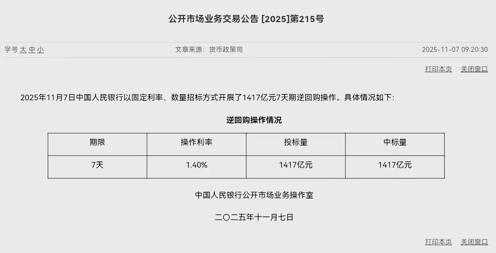 央行网站11月7日消息,央行今日开展1417亿元7天逆回购操作,操作利率为1.40%,与此前持平。因今日有3551亿元7天期逆回购到期,当日实现净回笼2134亿元。