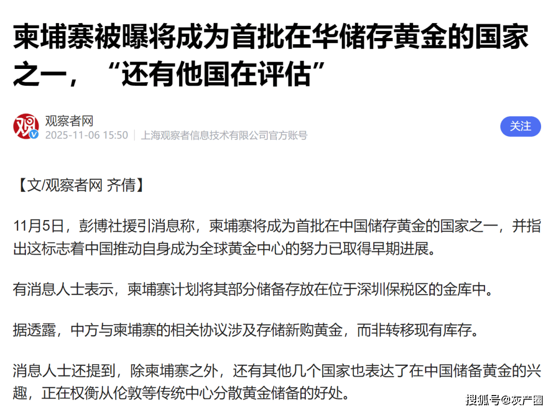 11月5日,彭博社援引消息称,柬埔寨将成为首批在中国储存黄金的国家之一,并指出这标志着中国推动自身成为全球黄金中心的努力已取得早期进展。