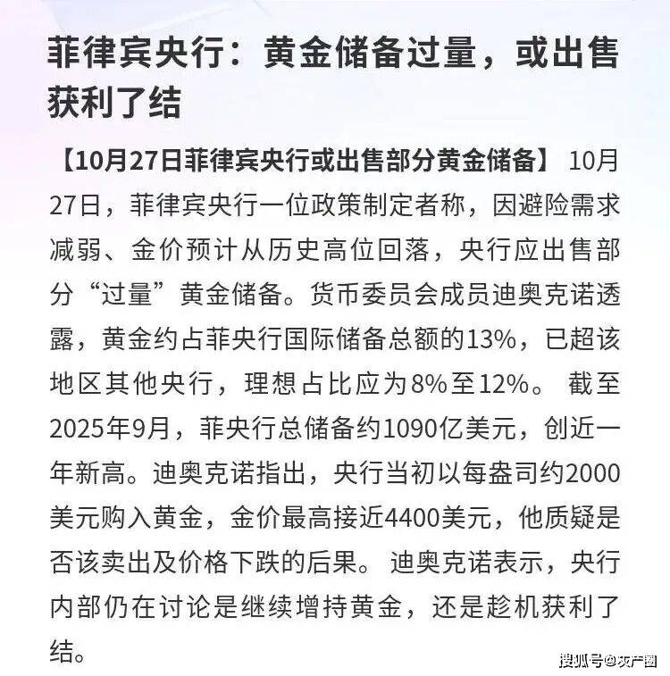 就比如说,菲律宾央行前段时间看到金价太高了,本国黄金储备过量,准备出售一部分获利了结。