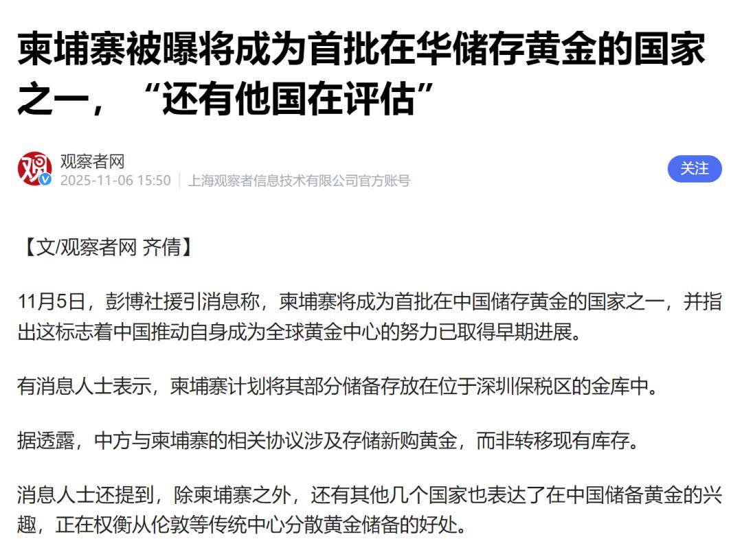这对美国来说可不是什么小事,实际上,无论是美国的纽约金库还是英国的伦敦金库,都在背后有美国华尔街资本的控制。而如今,随着美元持续走弱、美元信用体系的崩溃以及全球地缘政治风险的上升,黄金价格在上个月突破了4350美元每盎司。全球的央行纷纷增加黄金储备,并且采购的黄金几乎都是纯度达到99.5%以上的标准金条。这些金条一旦被购买回国,不仅面临巨大的运输风险,还会带来高昂的成本。事实上,上个世纪法国曾为了从美国运回黄金,甚至派遣了军舰。如今,黄金价格的上涨,也让越来越多的国家对美国失去了信任。柬埔寨的这一行动正是这一信任危机的体现。而且,这只是个开始,未来可能会有更多的国家效仿。