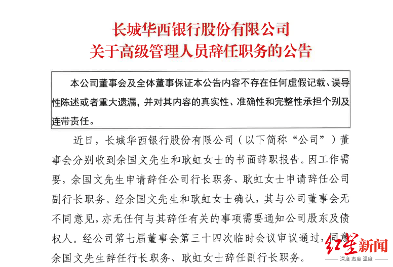 根据公告,该行董事会近日收到余国文、耿虹的书面辞职报告,因工作需要分别申请辞任行长、副行长职务。在公告中,长城华西银行用了近600字对两位高管表达了诚挚的谢意,称余国文在业务发展、深化改革、内控管理、合规建设、风险处置、平安运营等方面开展了卓有成效的工作;耿虹以战略远见和领导才能,为公司战略转型和高质量发展作出重要贡献。