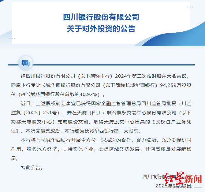 具体来看,今年6月25日,长城资产及其一致行动人在北京产权交易所公开挂牌转让合计持有长城华西银行40.92%的股权,转让底价达43.32亿元;7月14日,四川金融监管局官网发布文件,批复同意四川银行入股长城华西银行9.4259亿股股份(约占总股本40.92%);7月30日,完成摘牌及签约;9月30日,四川银行公告称已完成股权交割,成为长城华西银行第一大股东。