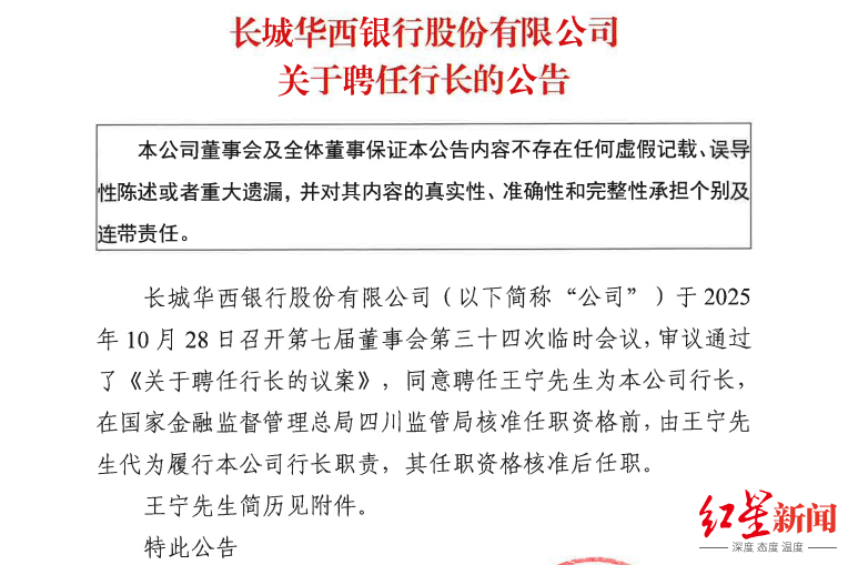 同日,长城华西银行挂出聘任新行长的公告,同意聘任王宁为新行长,其行长正式任职资格待监管核准后生效。
