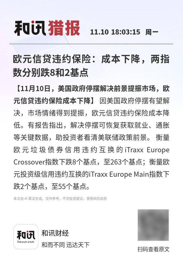 【11月10日,美国政府停摆解决前景提振市场,欧元信贷违约保险成本下降】因美国政府停摆有望解决,市场情绪得到提振,欧元信贷违约保险成本降低。有报告指出,解决停摆可恢复获取就业、通胀等关键数据,助投资者看清美联储政策前景。 衡量欧元垃圾债券信用违约互换的iTraxx Europe Crossover指数下跌8个基点,至263个基点;衡量欧元投资级信用违约互换的iTraxx Europe Main指数下跌2个基点,至55个基点。
